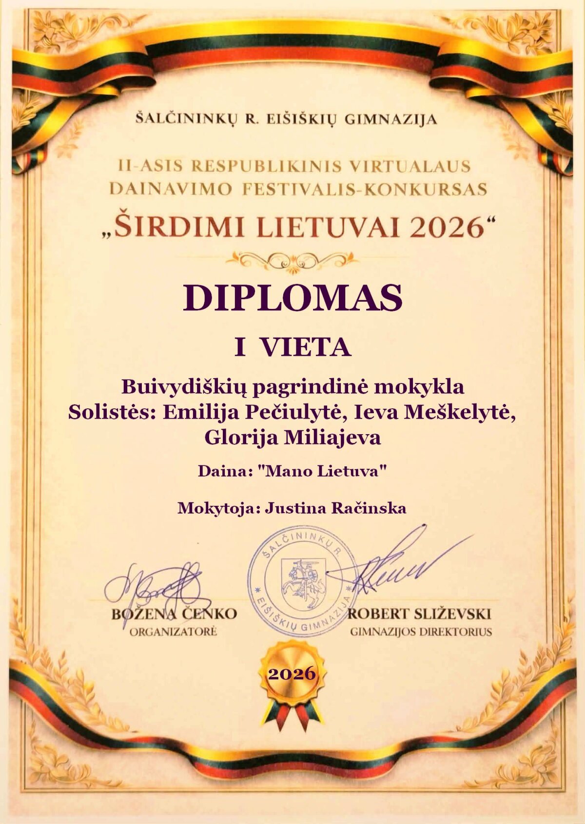 Džiaugiamės geromis naujienomis - 2b klasės mokinės Emilija, Ieva ir Glorija užėmė 1 vietą respublikiniame virtualiajame dainavimo festivalyje-konkurse ,,Širdimi Lietuvai 2026''! Mokines konkursui paruošė muzikos mokytoja Justina. Festivalio-konkurso tikslas – skatinti atlikėjus puoselėti lietuvišką muziką, ugdyti sceninę patirtį ir meninę išraišką, stiprinti meilę gimtajam kraštui bei kultūriniam paveldui per dainą.
