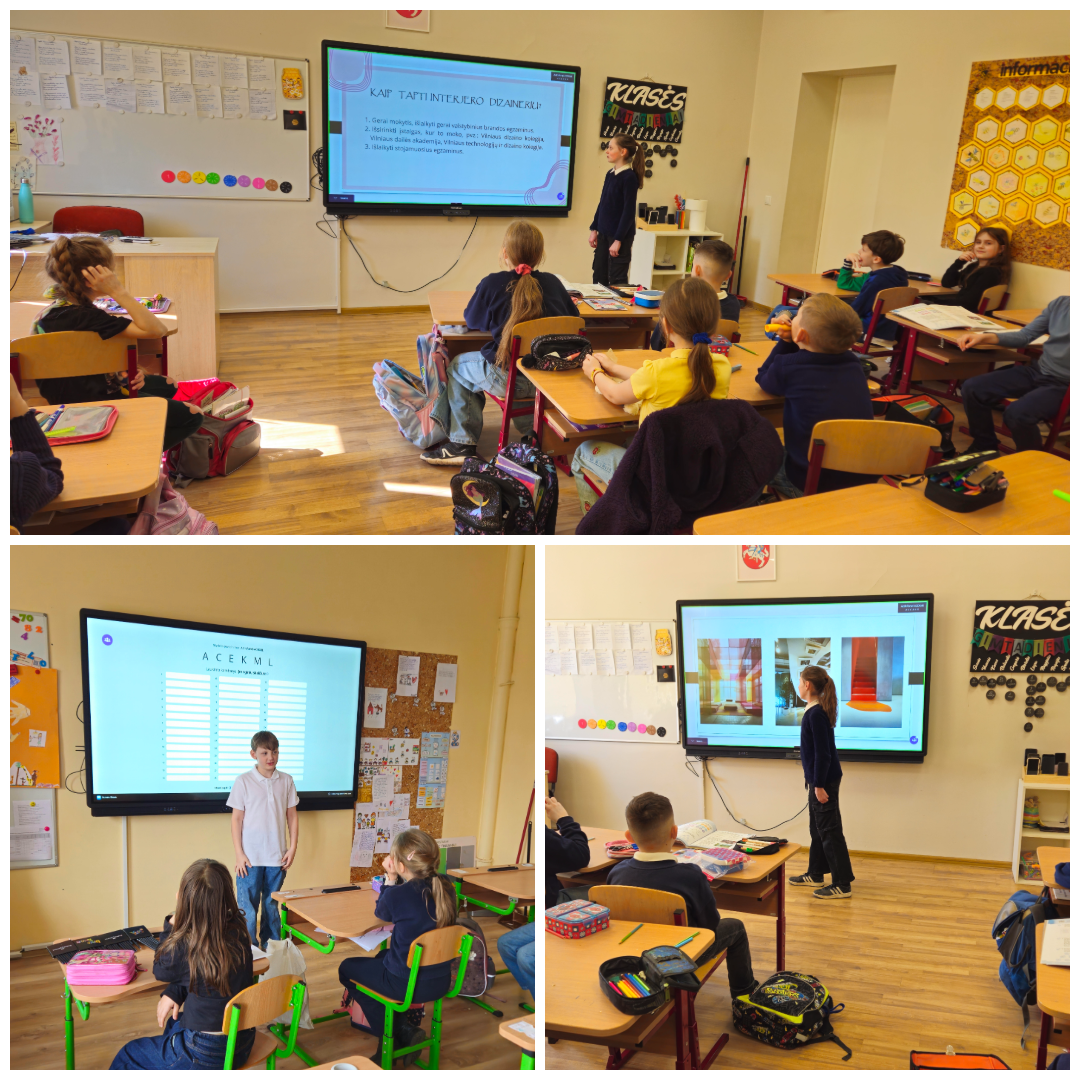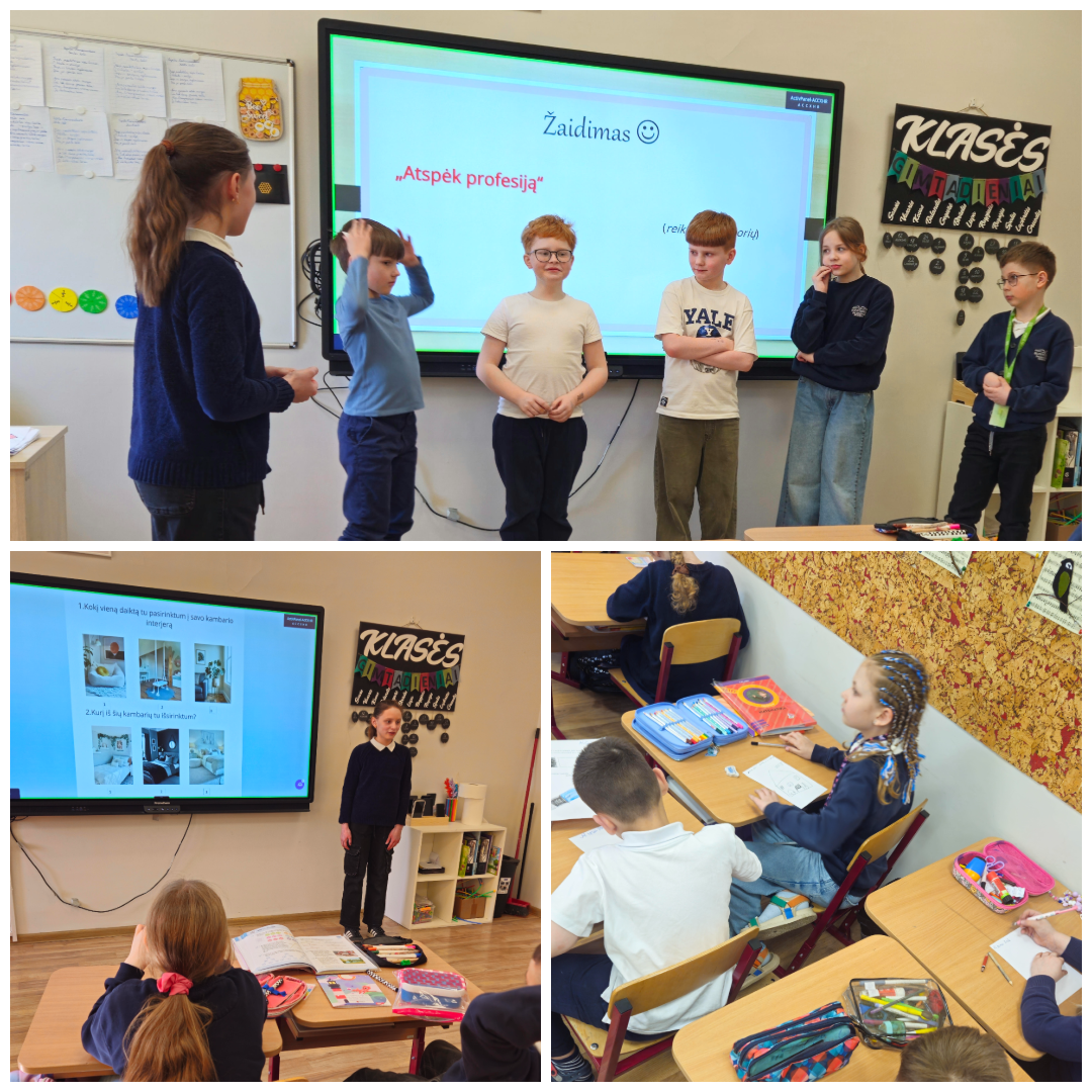 2a kl. pamoką vedė 6b kl. mokinė Paulina, ji pristatė savo sesės profesiją. Paulinos sesė studijuoja Vilniaus dizaino kolegijoje, o baigusi studijas bus interjero dizainerė. Pamokoje antrokai susipažino su interjero dizainerio specialybe, šio darbo subtilybėmis ir kokie dizaino interjero stiliai populiariausi. Vėliau mokiniai galėjo patys pasirinkti, koks interjero dizainas jiems gražus, kokiame kambaryje norėtų gyventi, atliko praktines užduotis bei sukūrė dizainą pieštukui.