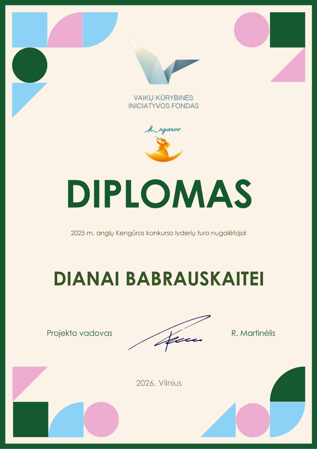 SVEIKINAME 8B klasės mokinę DIANĄ BABRAUSKAITĘ, tapusią anglų kalbos Kengūros lyderių turo nugalėtoja ir laimėjusią specialųjį prizą - pažintinę kelionę į užsienį! Labai džiaugiamės ir didžiuojamės! Dėkojame Dianai ir mokytojai Aistei Daminauskienei!