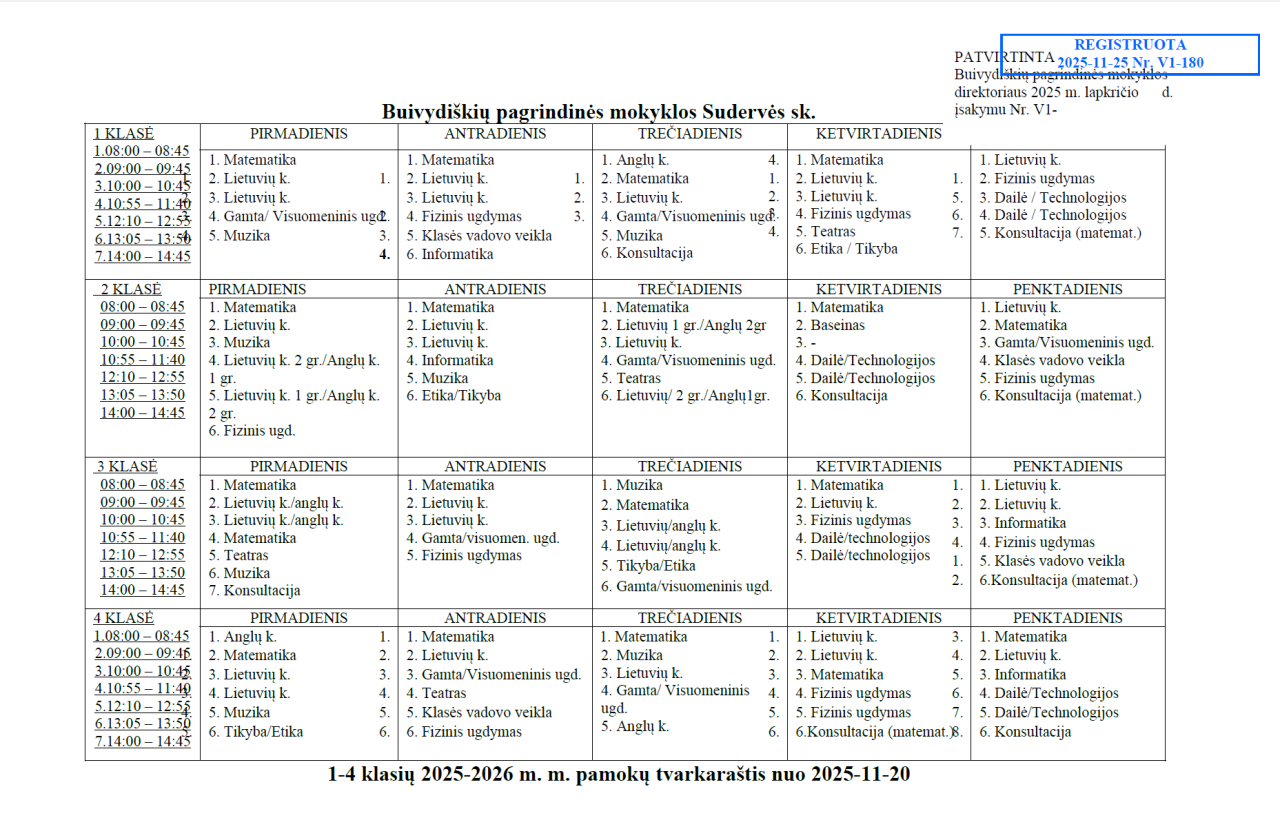 Sudervės pradinio ugdymo skyriaus pamokų tvarkaraštis 2025-2026 m. m.