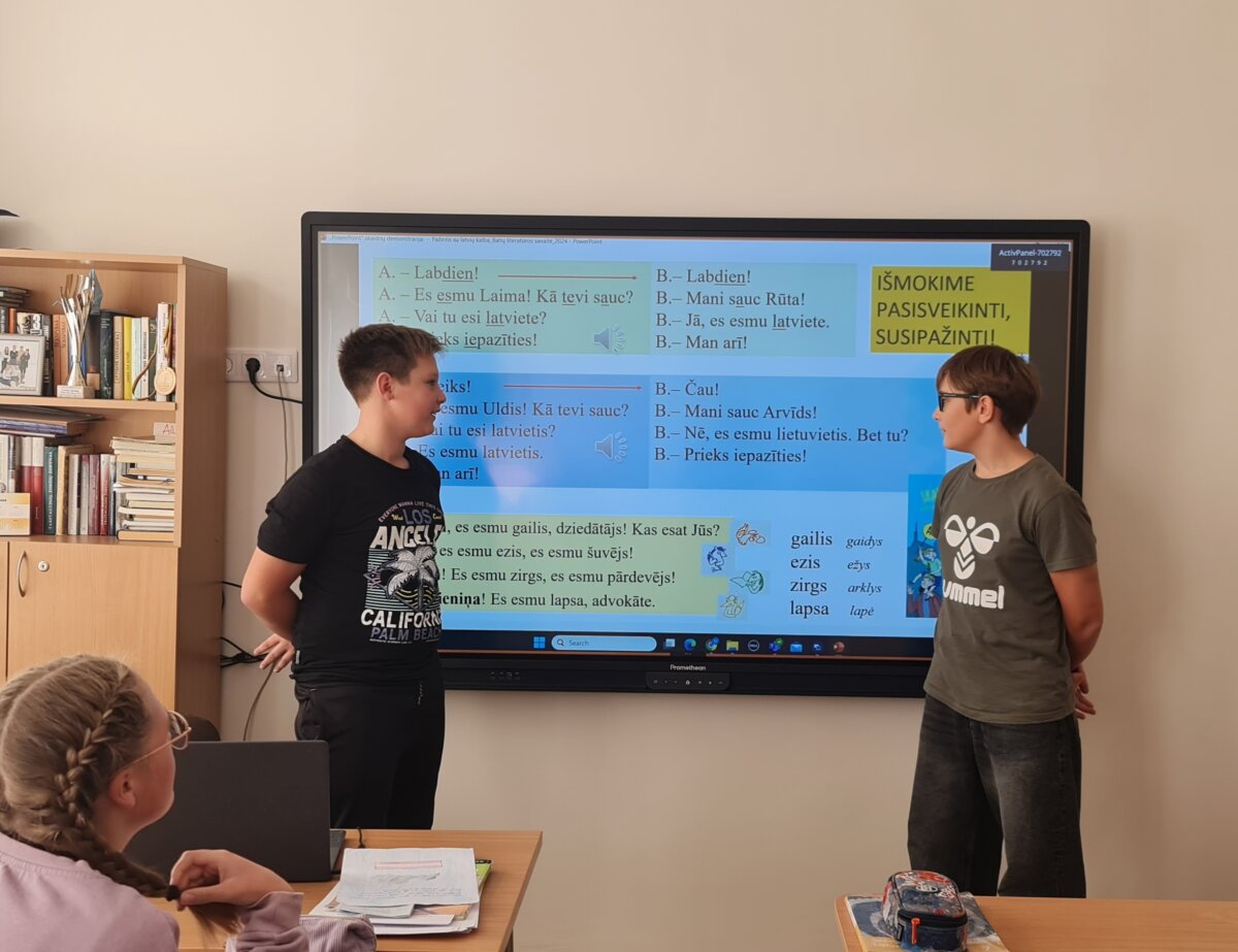 Visą Baltų literatūros savaitę mokykloje galima buvo girdėti tai vienoj, tai kitoj klasėj latvių kalbą. Mokiniai susidomėję žiūrėjo filmukus, diskutavo ir atliko praktines įdomias užduotis. 1A ir 2A klasėse vyko pamokos „Plastikiniai chuliganai“. Mokiniai diskutavo apie rūšiavimą, apie būdus, kuo galima plastmasinius maišelius pakeisti. 4A kl. mokiniai žiūrėjo animacinį filmą „Kioskas“. Jiems pavyko sudaryti pagrindinės veikėjos emocijų žemėlapį latvių kalba. Mokiniai, atlikdami šią užduotį, pastebėjo, kad dalis emocijų ir lietuvių, ir latvių kalbomis skamba panašiai. 6-7 kl. mokiniai nagrinėjo abiejų kalbų abėcėles ir garsų tarimą, skaitė, vertė tekstus ir kūrė pristatymus apie save latvių kalba. Džiugu, kad apibendrindami veiklas mokiniai jau patys galėjo įvardyti latvių ir lietuvių kalbų panašumus ir skirtumus. Uz tikšanos nākamreiz!