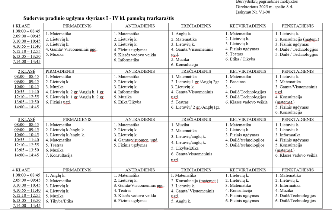 Sudervės pradinio ugdymo skyriaus pamokų tvarkaraštis 2025-2026 m. m. nuo 2025 m. rugsėjo 1 d.